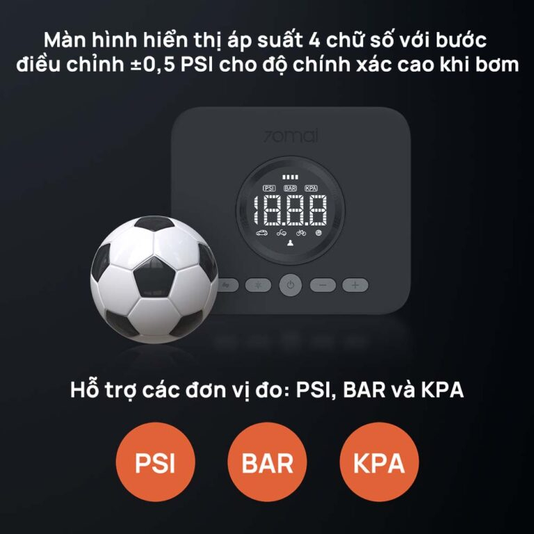 - Độ chính xác cao: Màn hình LED hiển thị áp suất với 4 chữ số, cho phép bước điều chỉnh nhỏ tới ±0,5 PSI, đảm bảo lốp xe luôn đạt mức áp suất lý tưởng nhất.