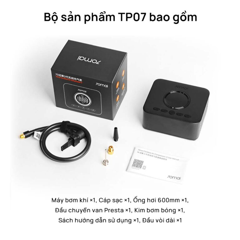 Bộ sản phẩm máy bơm hơi không dây 70mai TP07 mang đến sự tiện dụng tối đa cho người dùng khi trang bị đầy đủ các phụ kiện chuyên nghiệp trong cùng một hộp sản phẩm. Ngoài thiết bị chính là máy bơm khí, bộ sản phẩm còn đi kèm một ống hơi dài 600mm, cáp sạc, đầu chuyển van Presta, kim bơm bóng và đầu vòi dài, giúp bạn linh hoạt xử lý từ lốp ô tô, xe máy đến các loại bóng thể thao. Tất cả các thành phần đều được sắp xếp gọn gàng cùng sách hướng dẫn sử dụng chi tiết, đảm bảo bạn có mọi công cụ cần thiết để duy trì áp suất lốp hoàn hảo và an toàn cho mọi hành trình.
