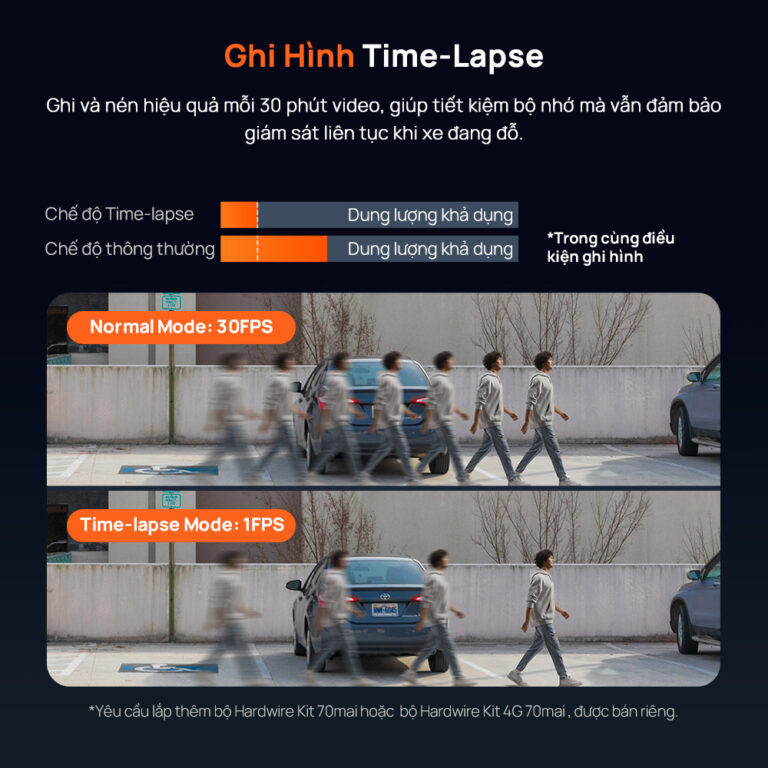 Ghi hình Time-Lapse: Tính năng này giúp tiết kiệm tối đa dung lượng bộ nhớ và cho phép bạn nhanh chóng xem lại toàn bộ diễn biến quanh xe trong suốt thời gian dài.