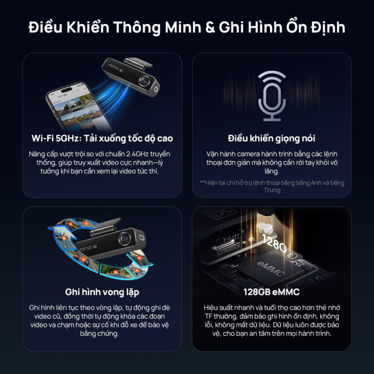 - Điều khiển giọng nói rảnh tay: Cho phép bạn vận hành camera bằng các câu lệnh thoại đơn giản, giúp thao tác nhanh chóng mà không cần rời tay khỏi vô lăng (hiện hỗ trợ tiếng Anh và tiếng Trung).