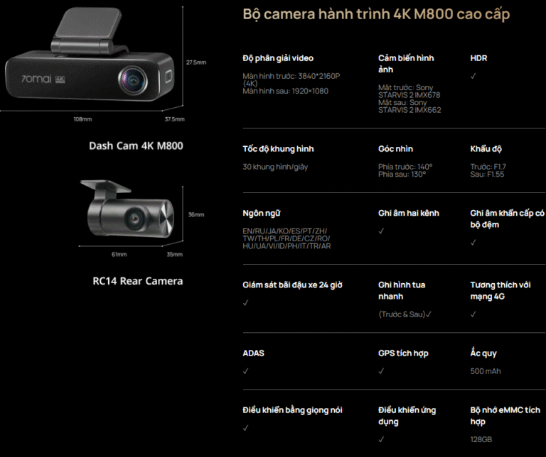 - Thông số kỹ thuật Camera hành trình 70mai M800