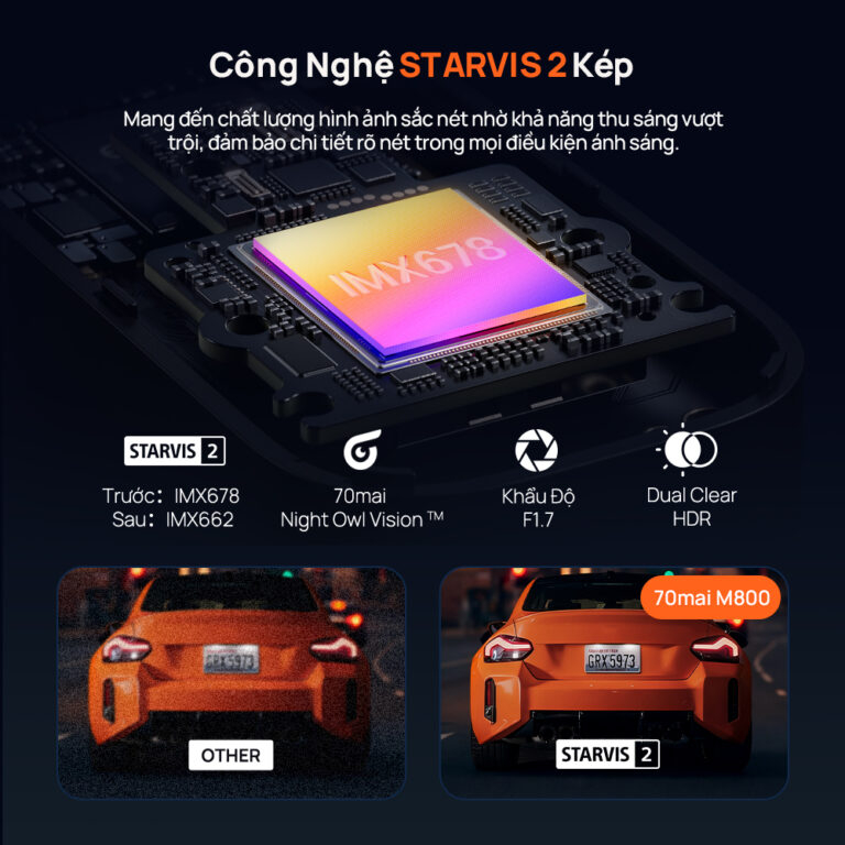 70mai M800 thiết lập tiêu chuẩn mới về ghi hình ban đêm nhờ được trang bị công nghệ Sony STARVIS 2 thế hệ mới trên cả camera trước và sau. Sự kết hợp giữa cảm biến cao cấp Sony IMX678 phía trước và IMX662 phía sau giúp thiết bị sở hữu khả năng thu sáng vượt trội, đảm bảo mọi chi tiết đều rõ nét và đáng tin cậy trong mọi điều kiện ánh sáng. Bên cạnh đó, với sự hỗ trợ từ công nghệ 70mai Night Owl Vision™, khẩu độ lớn F1.7 và tính năng Dual Clear HDR, camera mang lại những thước phim trong trẻo, bắt trọn các chi tiết quan trọng như biển số xe để cung cấp bằng chứng vững chắc bảo vệ quyền lợi của bạn trên mọi hành trình.