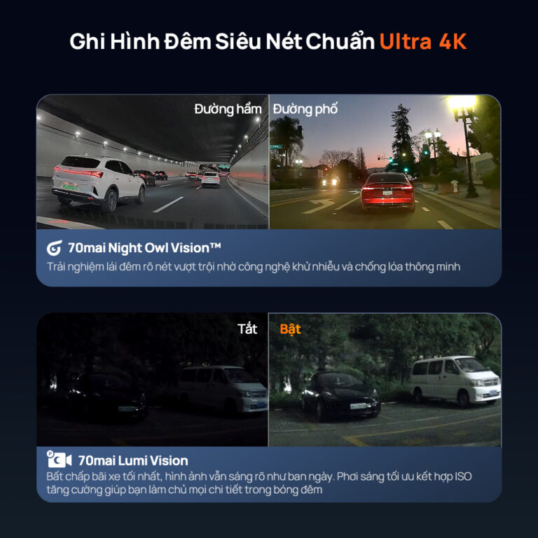 - 70mai Night Owl Vision™: Đây là công nghệ giúp nâng tầm trải nghiệm lái xe ban đêm thông qua khả năng khử nhiễu vượt trội và chống lóa thông minh. Nhờ điều chỉnh độ phơi sáng động mang lại hình ảnh trong trẻo và sắc nét hơn khi xe di chuyển qua các khu vực có ánh sáng phức tạp như đường hầm hay phố thị ban đêm.